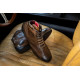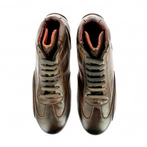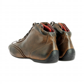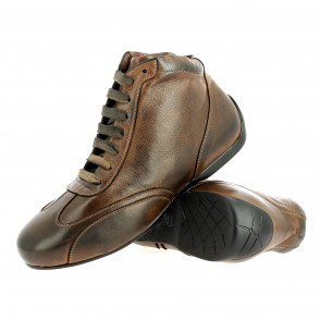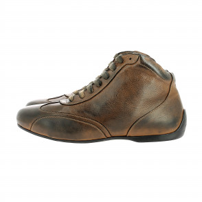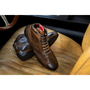 Chaussures de conduite mi-haute, modèle originel des pilotes de course, en veau pleine fleur, patinées en pièce, lacées, intérieur en cuir rouge matelassé.