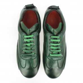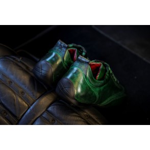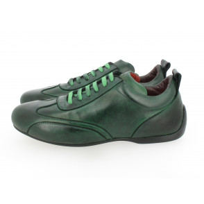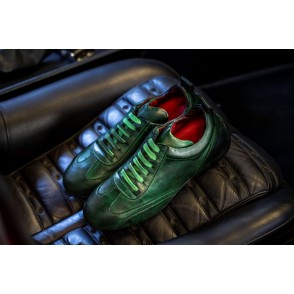 Chaussures de conduite basse en veau pleine fleur, patinées en pièce, lacées, intérieur en cuir matelassé.