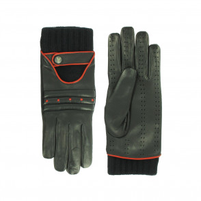 Gants de conduite en agneau nappa, gant intérieur non amovible en cachemire double fil, matelassé main, bords et découpes de couleurs, double perforation sur la paume, couture interne des fourchettes, bouton pression au poignet.