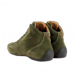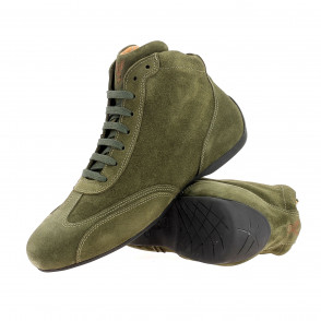 Mid-highdriving shoes in suede calfskin, laced, quilted leather interior. This style is the original design of the racing pilots shoes.
